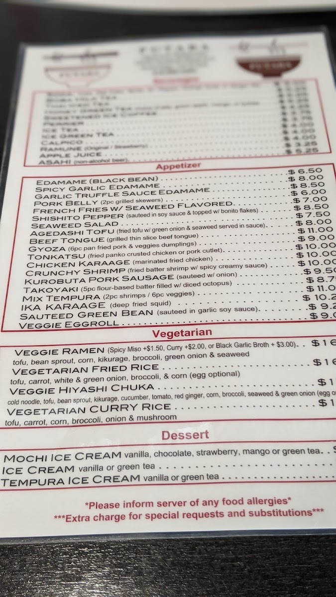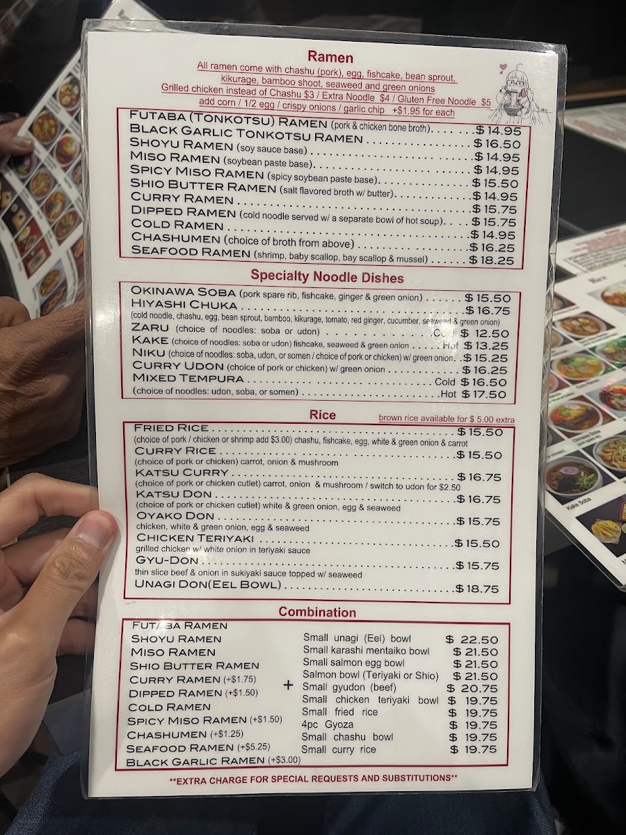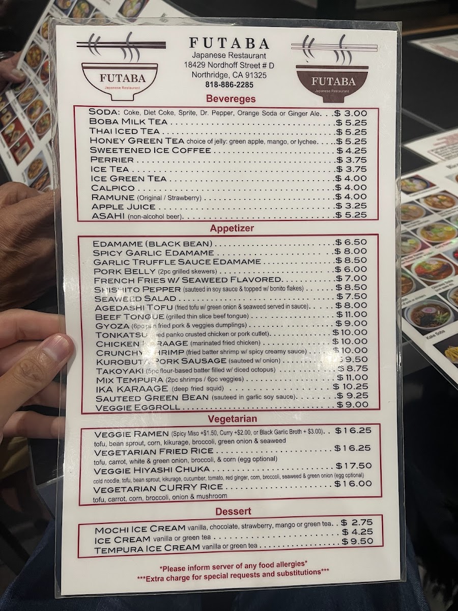 If you're a vegetarian, don't miss the Veggie Ramen or the Veggie Hiyashi Chuka, both bursting with fresh vegetables and savory tofu. With prices ranging from $17.50 to $19.50, Futaba ensures a variety of options that cater to all preferences.